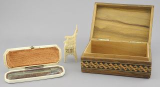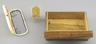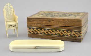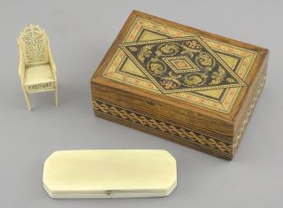 Toothpick Holder (damaged) / Bone Chair / Tunbridge Ware Box, 4 1/2", NO EXPORT.