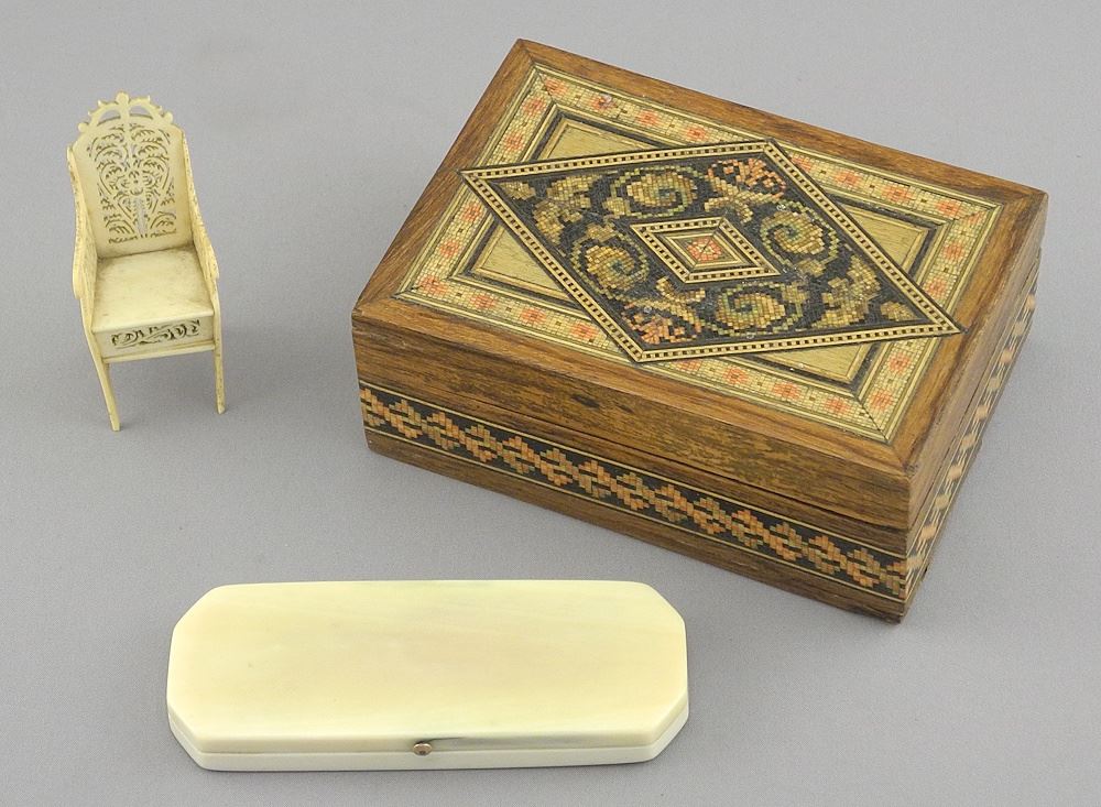 LOT 41 Toothpick Holder (damaged) / Bone Chair / Tunbridge Ware Box, 4 1/2", NO EXPORT. Estimate: $60 - $100 Sold For: $60 Auction Date: Tuesday, March 25 2025 at 4:00 PM
