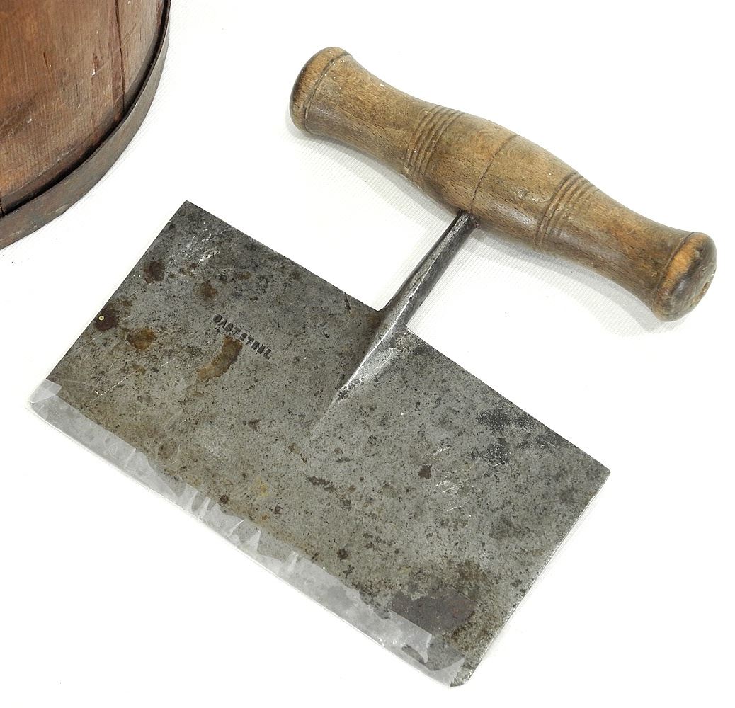 LOT 154 Antique Maple Syrup Bucket, 1800's Cast Steel Chopper & Georgian Barrels. Estimate: $60 - $100 Sold For: $60 Auction Date: Tuesday, March 25 2025 at 4:00 PM