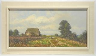 Oil on Canvas signed H. Reuter, 16 x 31 1/2", "Landscape with Sheep Farmer".