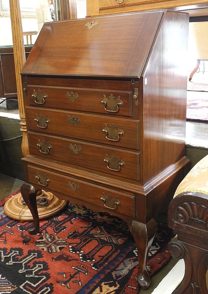 LOT 100 Petite Mahogany Bureau Raised on Legs, 40"h. Estimate: $200 - $300 Sold For: $180 Auction Date: Tuesday, May 27 2025 at 4:00 PM