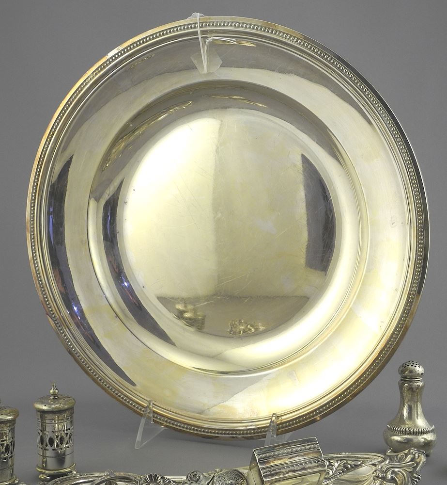 LOT 234 Christofle Silver Plated Dish with Plated & Silver Sundries (as found/ condition noted). Estimate: $60 - $100 Sold For: $30 Auction Date: Tuesday, May 27 2025 at 4:00 PM