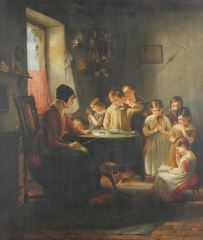 LOT 340 Oil on Canvas After George Augustus Freezor, 21 3/4 x 18 3/4", "Morning Prayers". Estimate: $100 - $150 Auction Date: Tuesday, May 27 2025 at 4:00 PM