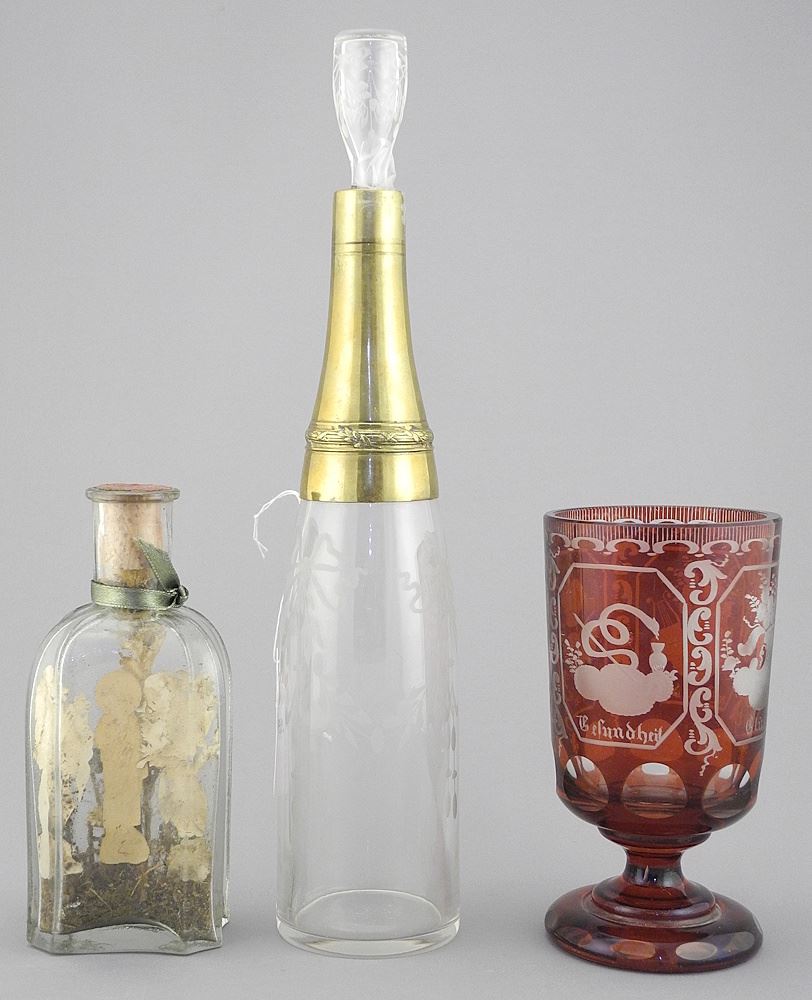 LOT 73 Three Glass Items: Bohemian Ruby Flash Beaker/Crucifixion Bottle/ Tapered Bottle, 5 3/8 - 11 Estimate: $60 - $100 Sold For: $70 Auction Date: Tuesday, May 27 2025 at 4:00 PM