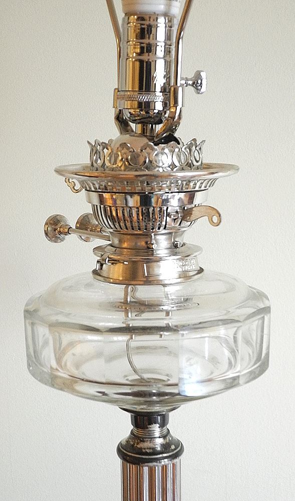 LOT 20 Silver Plated Oil Lamp Converted To Electricity, 30" With Shade Estimate: $150 - $250 Auction Date: Tuesday, May 27 2025 at 4:00 PM