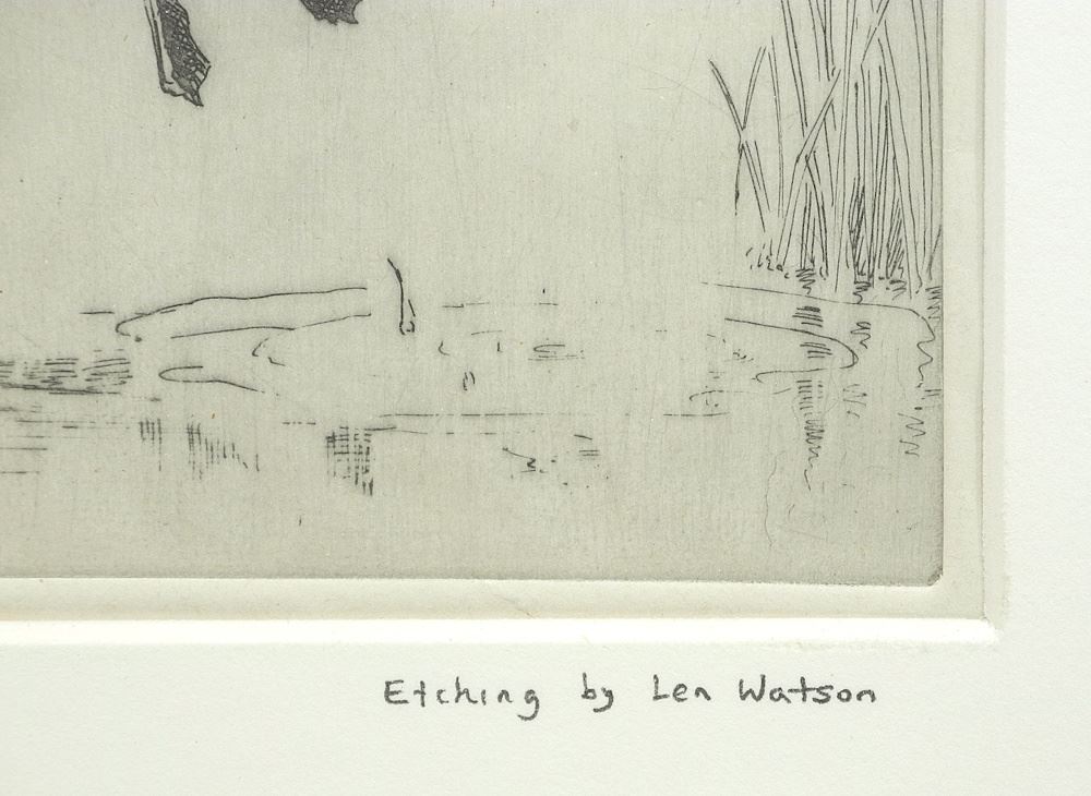 Etching by Len Watson, 6 3/8 x 5 1/4", "Mallard in Flight".