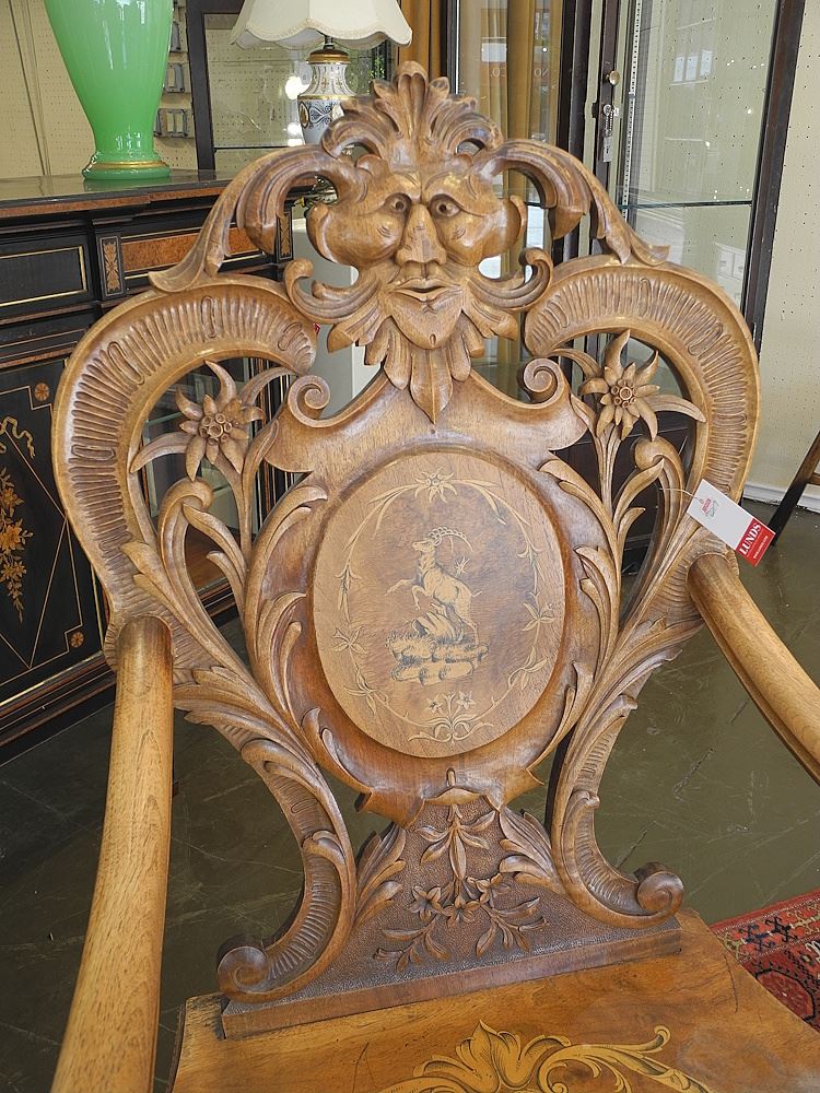 LOT 154 19th C. Black Forest Armchair, Inlaid Walnut, 45 3/4"h. Estimate: $150 - $300 Sold For: $600 Auction Date: Tuesday, September 23 2025 at 4:00 PM