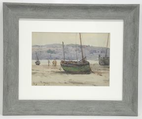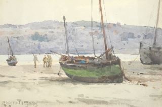 Watercolour signed Reginald Jones, 6 7/8 x 10 1/8", "Fisherman Low Tide St Ives".