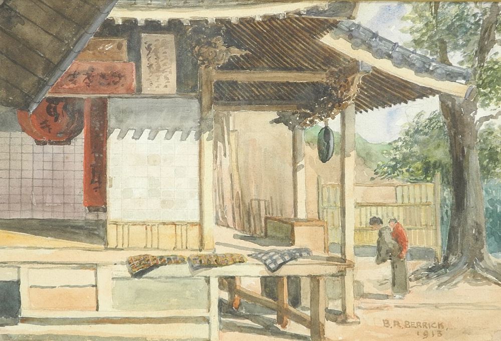 Watercolour signed B. (Bertram) R. Berrick 1913, 7 1/4 x 11", "Figures Outside Temple...".