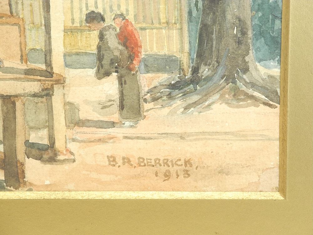 LOT 188 Watercolour signed B. (Bertram) R. Berrick 1913, 7 1/4 x 11", "Figures Outside Temple...". Estimate: $60 - $100 Sold For: $70 Auction Date: Tuesday, September 23 2025 at 4:00 PM