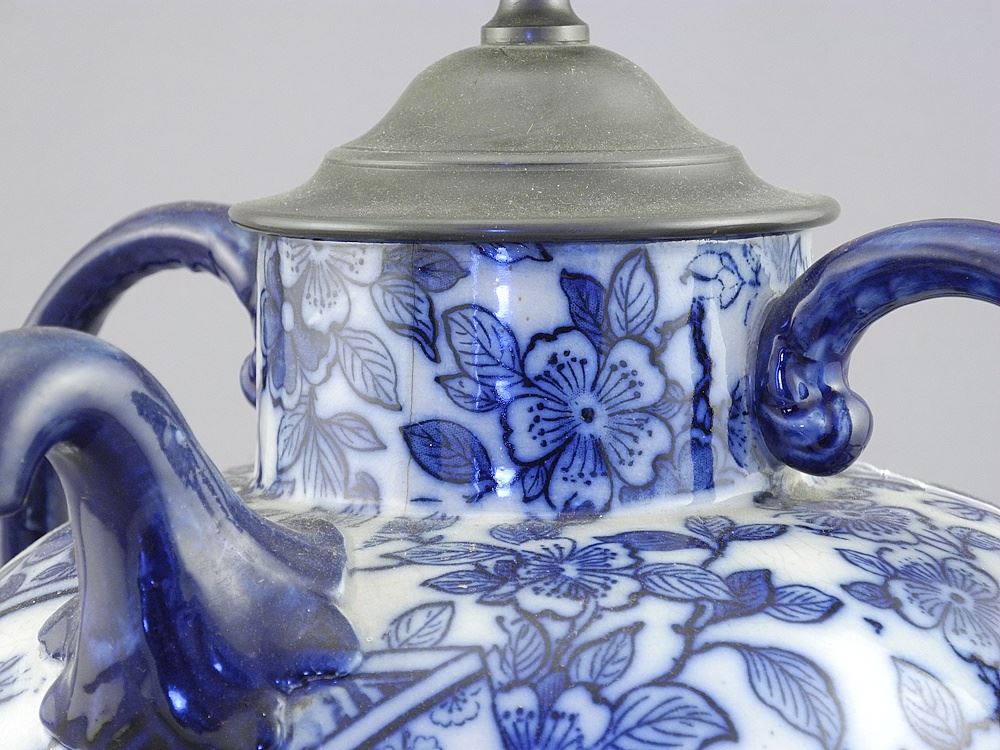 Doulton's Burslum for J.J.Royle Manchester 1886 Blue & White Self- Pouring Tea Pot (cracked).