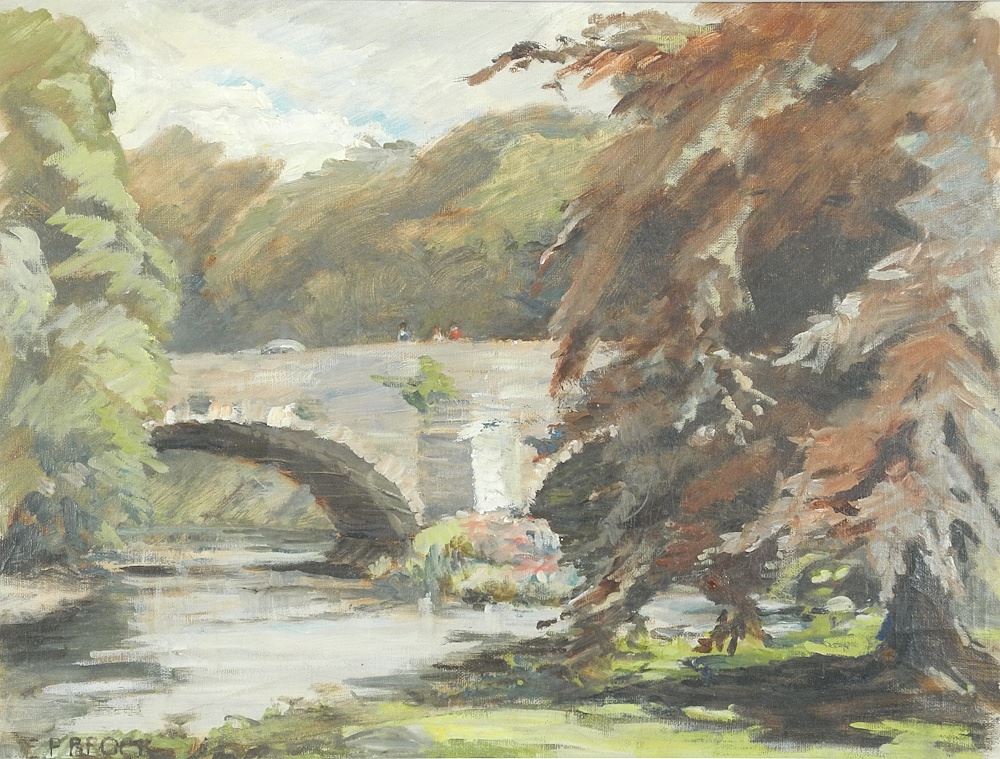 Oil on Canvas Mounted to Board signed E.P.Brock, 14 3/4 x 19 1/4", "Figures Upon Bridge".