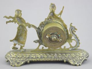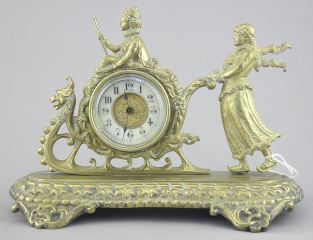 LOT 64 British United Clock Co. Brass "Skater & Sled" Clock, 8 3/8"w (requires service). Estimate: $100 - $120 Sold For: $100 Auction Date: Tuesday, September 23 2025 at 4:00 PM