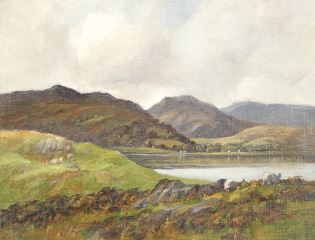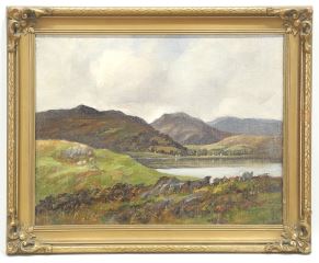 LOT 156 Oil on Canvas Board signed W.R. Adams, 13 1/2 x 17 1/2", "Highland Scene w/ Sheep & Lake". Estimate: $100 - $200 Auction Date: Tuesday, September 23 2025 at 4:00 PM