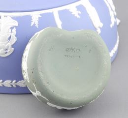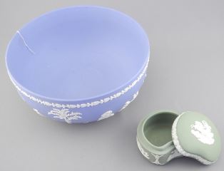 LOT 132 Wedgwood Blue Jasper Ware Bowl (8" diameter) & Sage Box. Estimate: $50 - $60 Sold For: $45 Auction Date: Tuesday, September 23 2025 at 4:00 PM