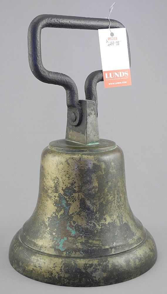 LOT 128 Antique Brass Bell with Wrought Iron Handle, 11 3/8"h. Estimate: $100 - $200 Sold For: $90 Auction Date: Tuesday, September 23 2025 at 4:00 PM
