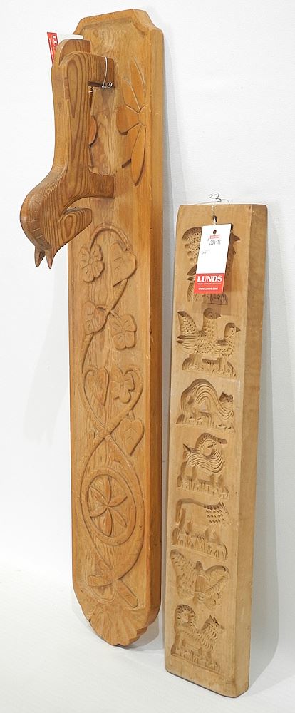 LOT 77 1920's Norwegian Hand Carved Mangle Board (28"L) & a Wooden Mold, 20"h. Estimate: $80 - $100 Sold For: $70 Auction Date: Tuesday, September 23 2025 at 4:00 PM
