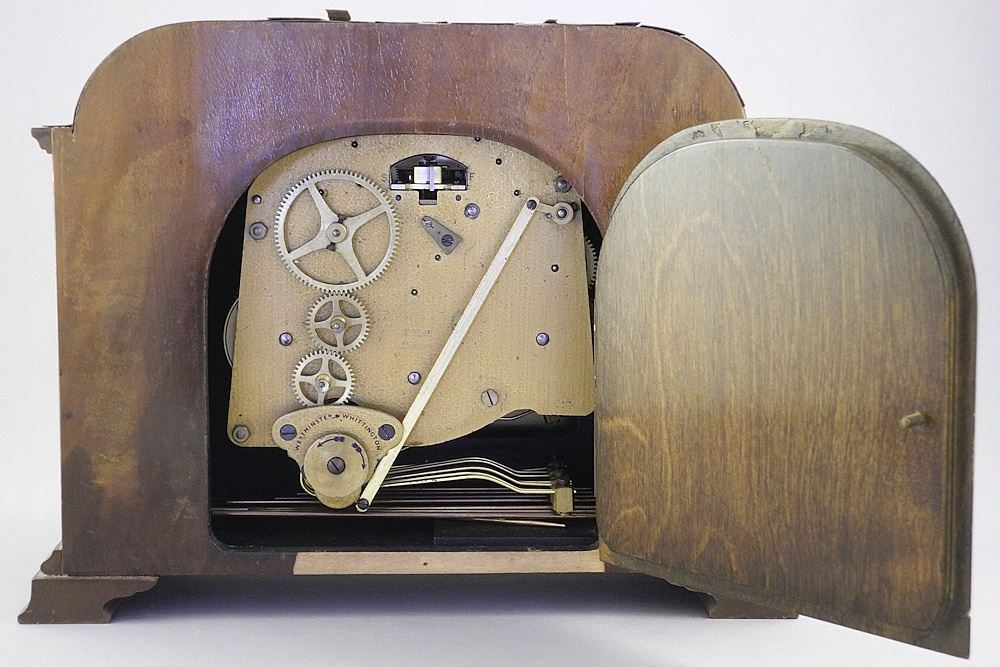 LOT 299 Elliott Walnut Mantle Clock, 12"w (damage noted). Estimate: $50 - $150 Sold For: $60 Auction Date: Tuesday, September 23 2025 at 4:00 PM
