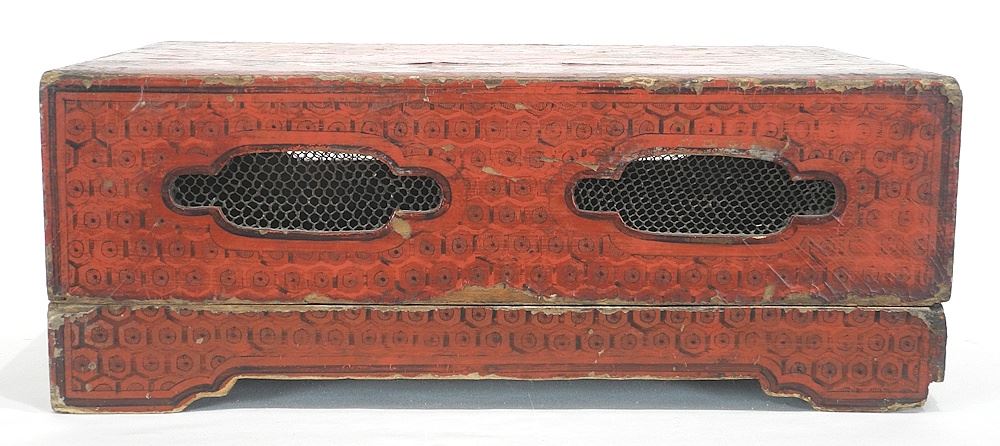LOT 166 Chinese Scarlet Lacquer Grille Cricket Box, 7 1/2 x 19 x 12 1/4" (condition noted). Estimate: $100 - $200 Auction Date: Tuesday, September 23 2025 at 4:00 PM
