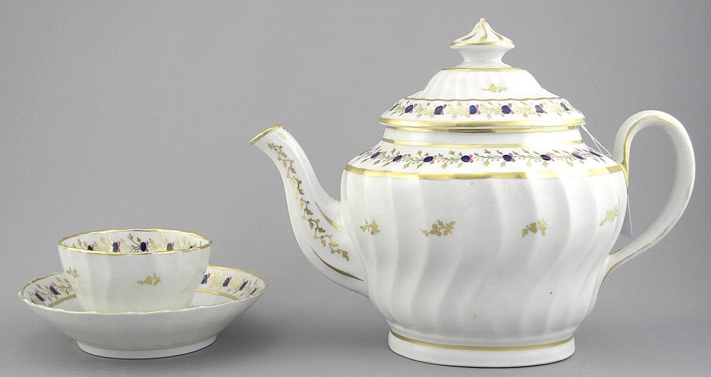 Chamberlains Worcester Teapot with Four Matching Tea Bowls & Saucers, 7"h.