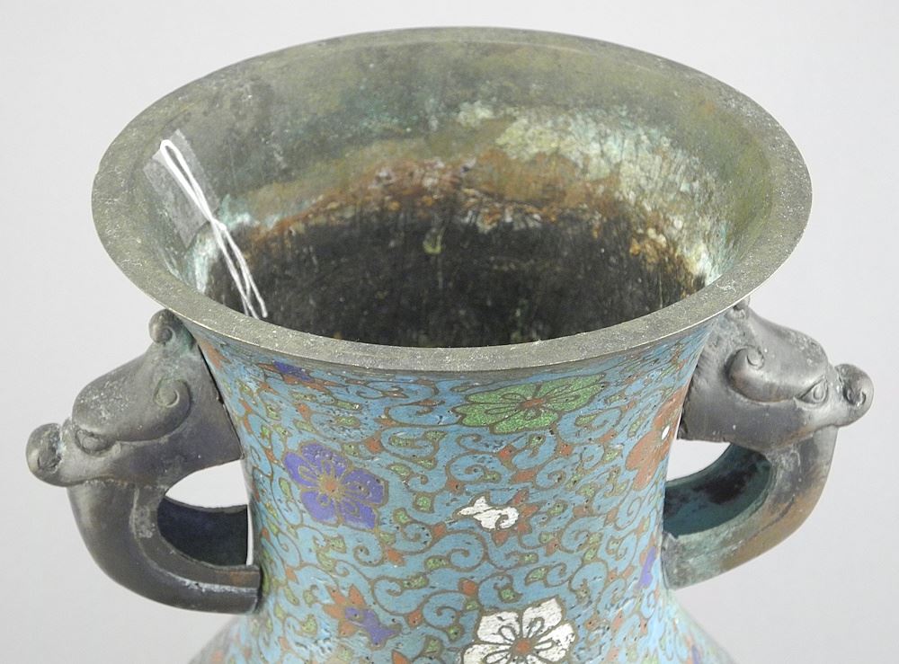 Chinese Cloisonne Vase with Dragon Handles, 9 Character Mark, 12"h.