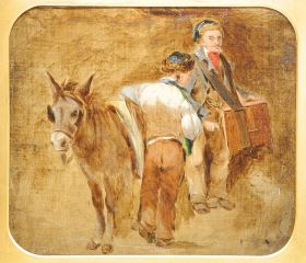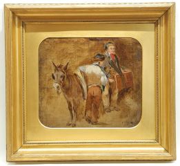 LOT 27 Oil on Canvas European School 19th C , 9 x 10 1/4", "Boys with Hurdy Gurdy & Donkey". Estimate: $60 - $100 Sold For: $40 Auction Date: Tuesday, November 04 2025 at 4:00 PM