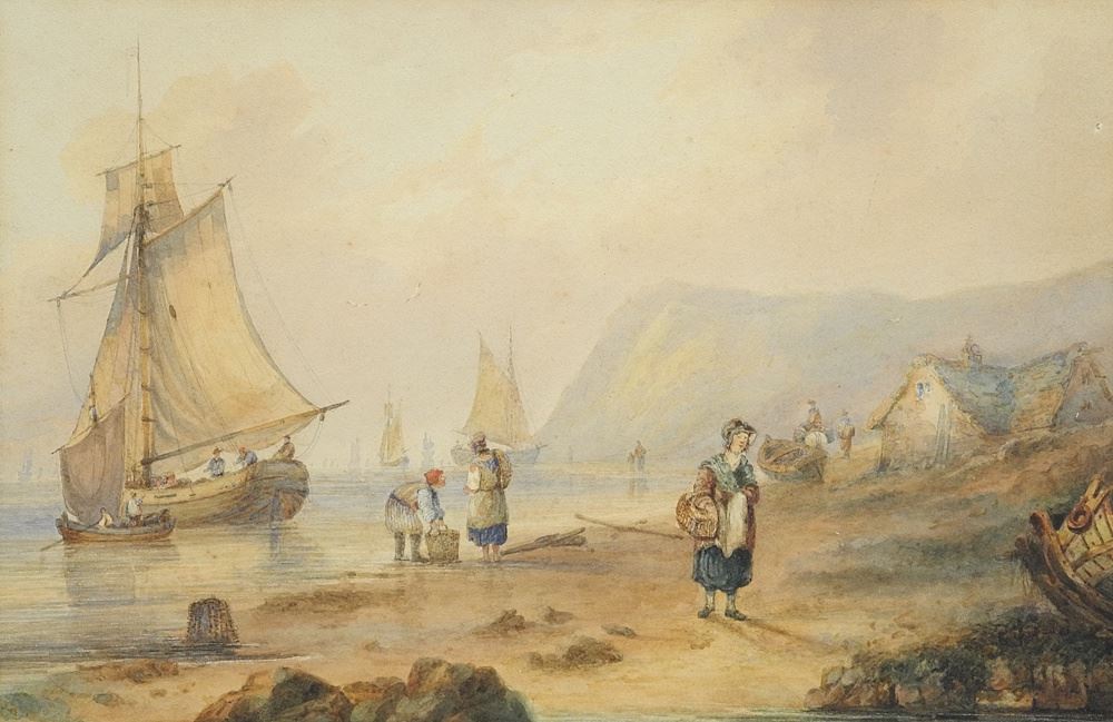 Watercolour English School 19th C., 9 x 13 5/8", "Coastal View with Fisher Folk".