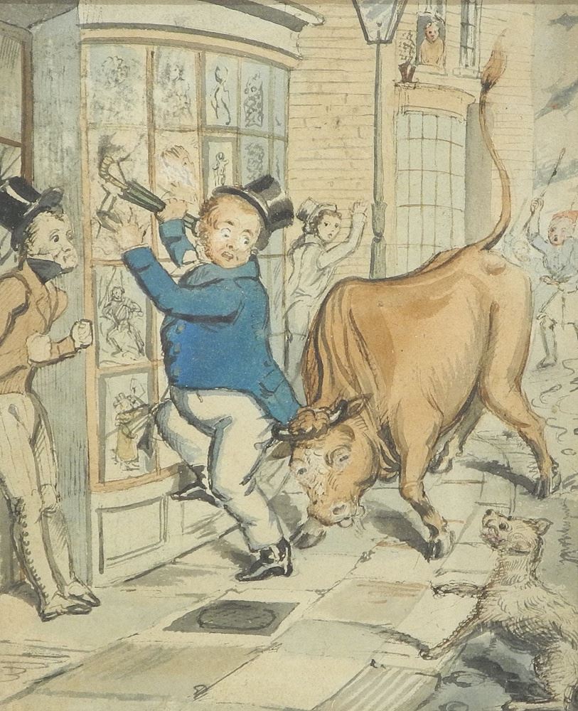 Drawing English School Early 19th C. , 7 1/4 x 6", "Bull Engaging Man by China Shop".