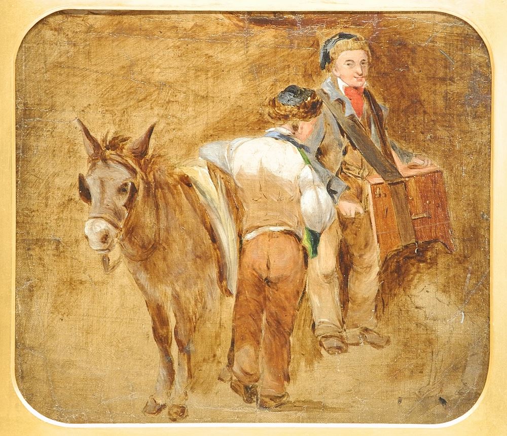 Oil on Canvas European School 19th C , 9 x 10 1/4", "Boys with Hurdy Gurdy & Donkey".