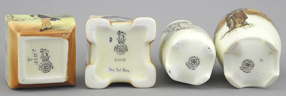 LOT 267 Four Miniature Royal Doulton Dickens Ware Vases: Fat Boy, Bill Skyes, Fagin & Mr. Pickwick. Estimate: $50 - $100 Sold For: $45 Auction Date: Tuesday, November 04 2025 at 4:00 PM