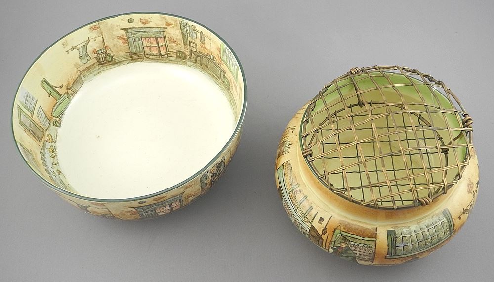 LOT 73 Two Royal Doulton Dickens Ware Items , Bowl, 8"/Vase with Flower & Frog, 6"w. Estimate: $50 - $100 Sold For: $35 Auction Date: Tuesday, November 04 2025 at 4:00 PM