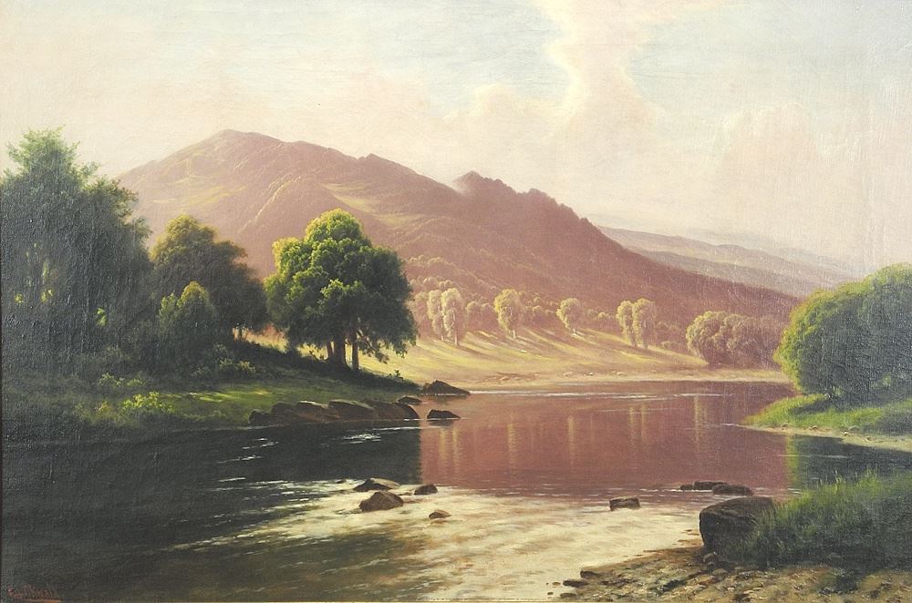 LOT 35 Oil on Canvas signed F.Chwala, 20 3/4 x 31", "Riverscape in Dwindling Sun". Estimate: $500 - $1,000 Auction Date: Tuesday, November 04 2025 at 4:00 PM