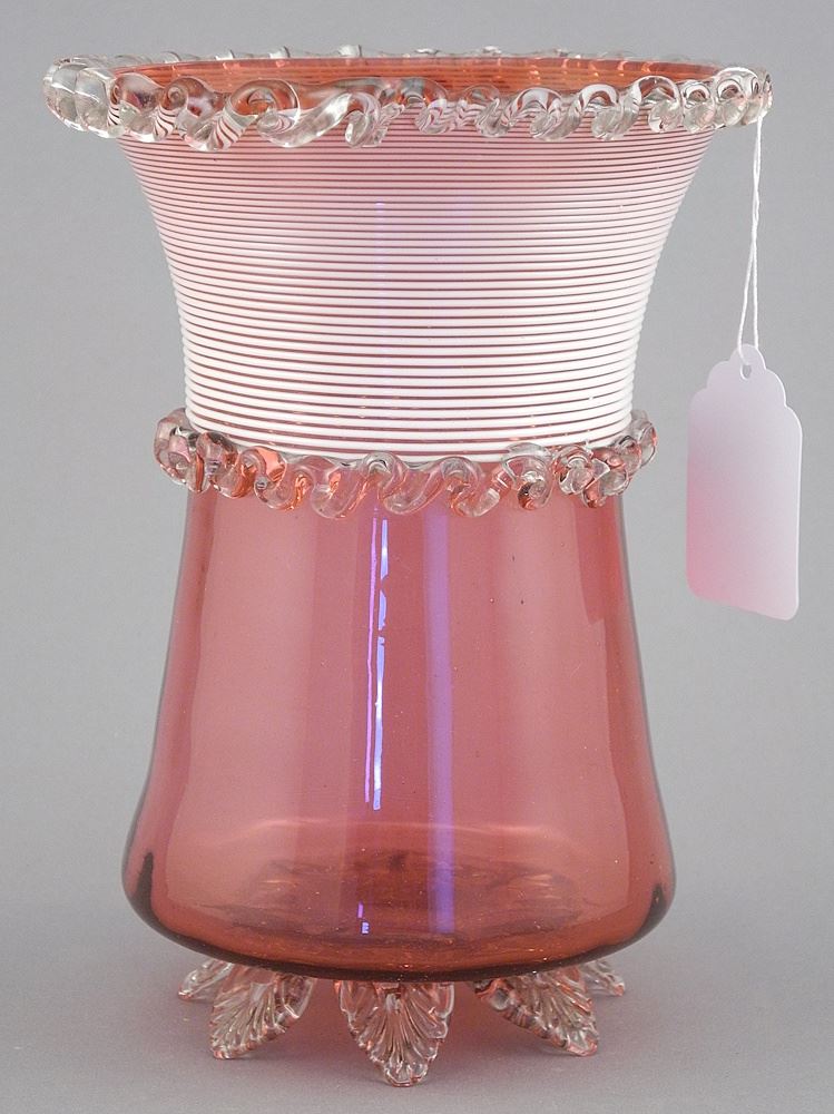 Two Cranberry Glass Covered Dishes & Threaded Celery Vase, 5 1/8 - 6 3/4" h.