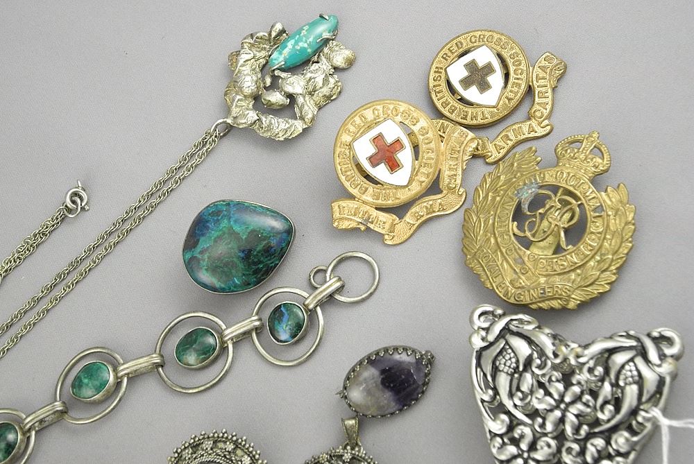 LOT 245 Collection of Red Cross Pins/Ethnic Jewelry/Hair Piece/Malachite Jewelry Estimate: $60 - $100 Sold For: $20 Auction Date: Tuesday, November 04 2025 at 4:00 PM