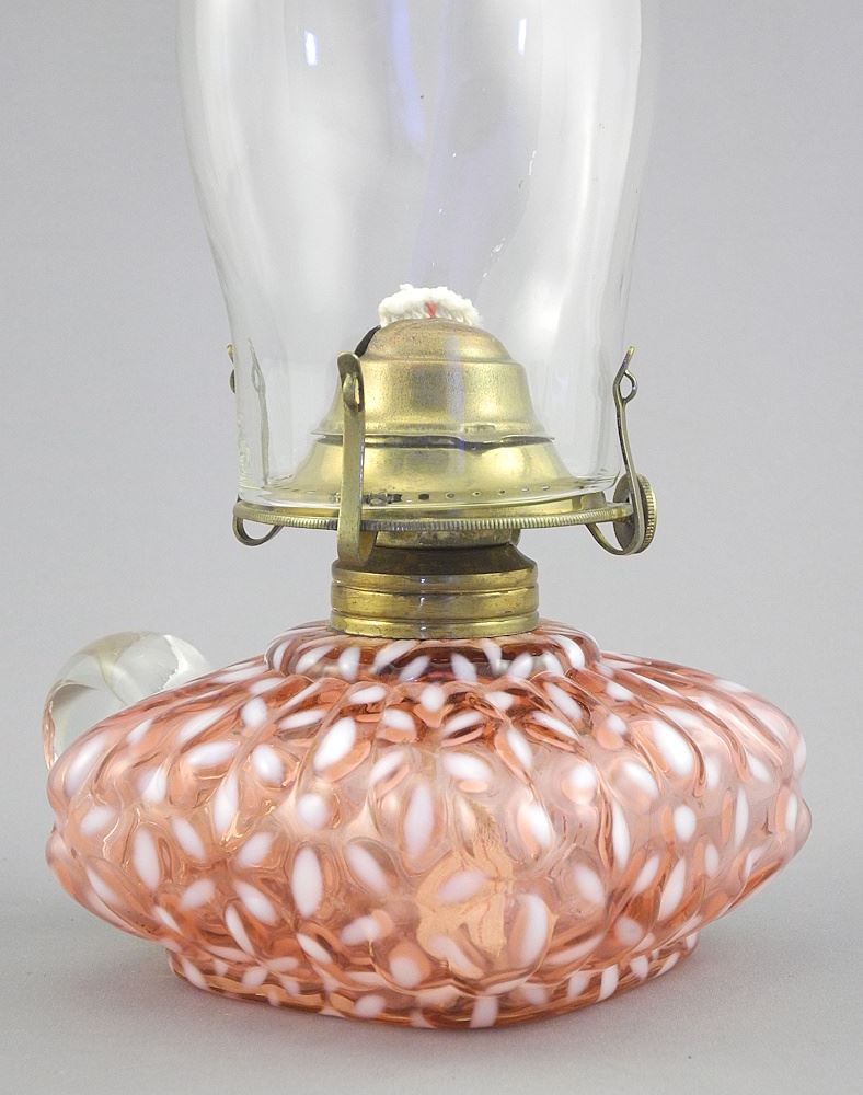 LOT 3 Antique American Hobbs Cranberry Opalescent Snowflake Oil Lamp & Chimney, 13 1/4"h. Estimate: $50 - $70 Sold For: $50 Auction Date: Tuesday, November 04 2025 at 4:00 PM