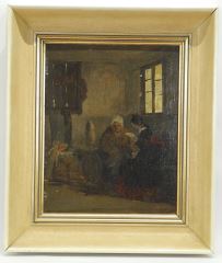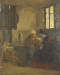 Oil on Board signed Indistinctly, 11 5/8 x 9", "Women Spinning".