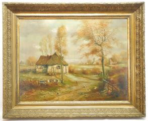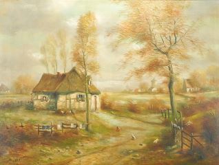 LOT 69 Oil on Canvas signed J.Paschal, 26 1/2 x 34 1/2", "Country Homestead with Chickens". Estimate: $150 - $300 Sold For: $130 Auction Date: Tuesday, November 04 2025 at 4:00 PM