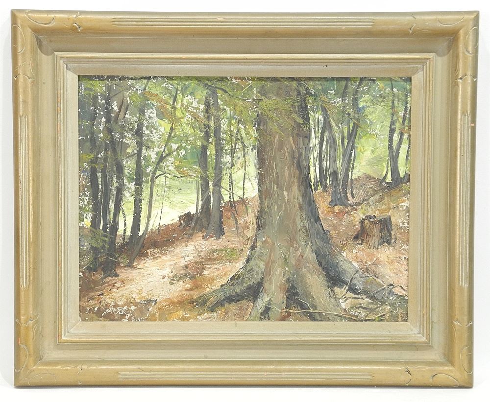 Oil on Board by June Norfolk, 12 x 16", "Woodland Interior", COA Verso.