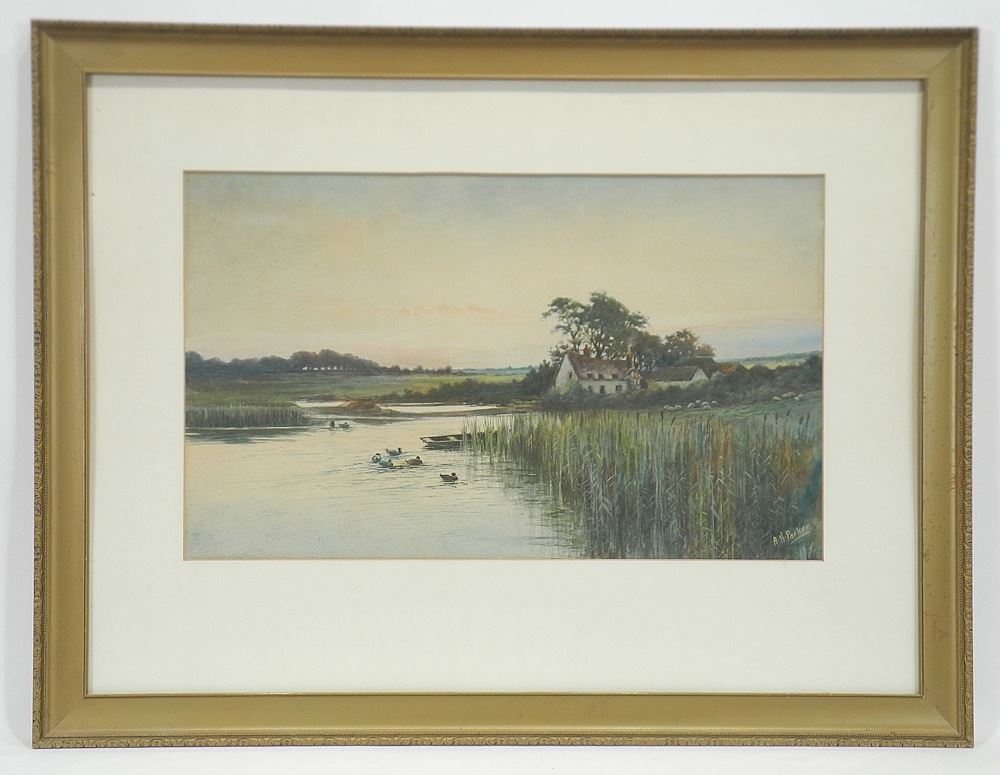 LOT 166 Watercolour signed A.H. Parker, 11 5/8 x 19 1/4", "Ducks in Marsh, Sheep In The Distance". Estimate: $60 - $100 Auction Date: Tuesday, April 21 2026 at 4:00 PM