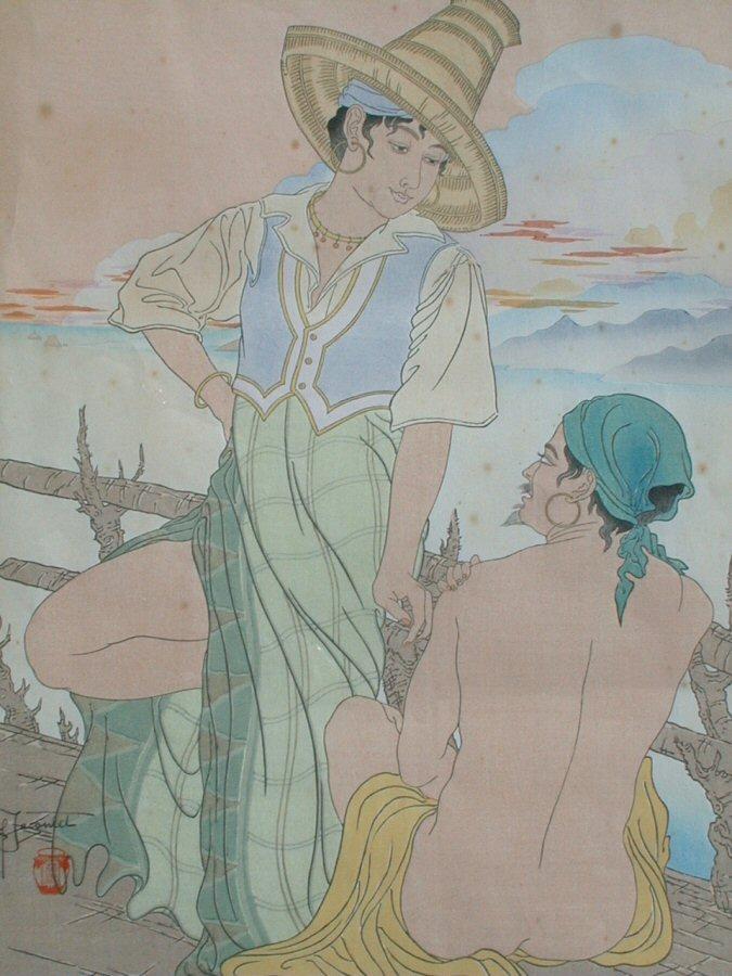 Coloured woodblock print signed in plate Paul Jacoulet, 15 3/8 x 11 3/4 "Man and Woman by a Fence"