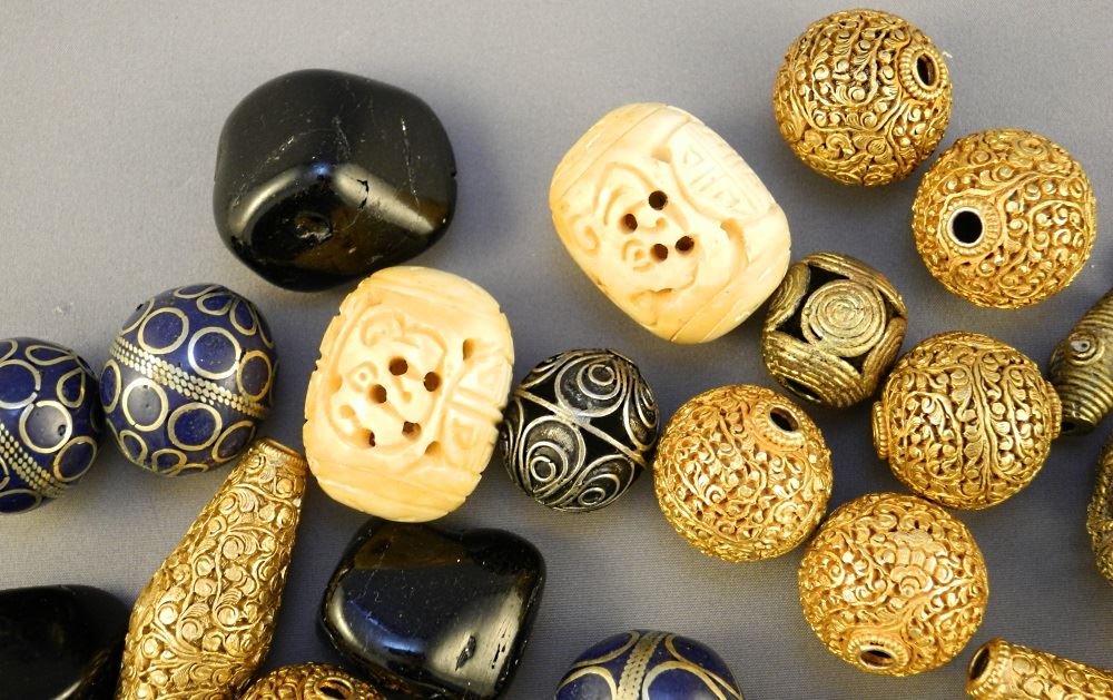 LOT 194 Collection of Various Fancy Beads: Embossed Gold Wash, Amber Boulders, Carved Bone, etc. Estimate: $100 - $200 Sold For: $100 Auction Date: Tuesday, March 02 2021 at 6:00 PM