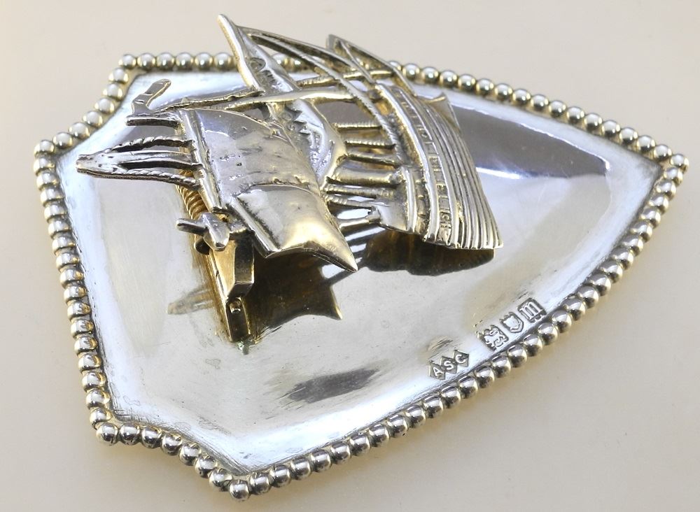 LOT 3 Antique London Sterling Ship & Shield Paper Clip, 3", ASC-Maker, Hallmarked C1907. Estimate: $100 - $200 Sold For: $180 Auction Date: Tuesday, May 11 2021 at 6:00 PM