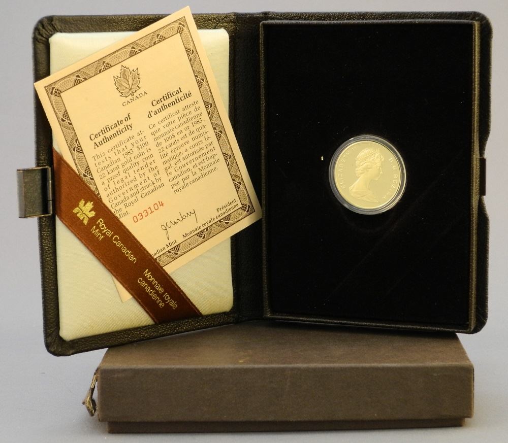 LOT 194 Cased Canadian $100 Gold Coin 1983. Estimate: $500 - $600 Sold For: $900 Auction Date: Tuesday, May 11 2021 at 6:00 PM