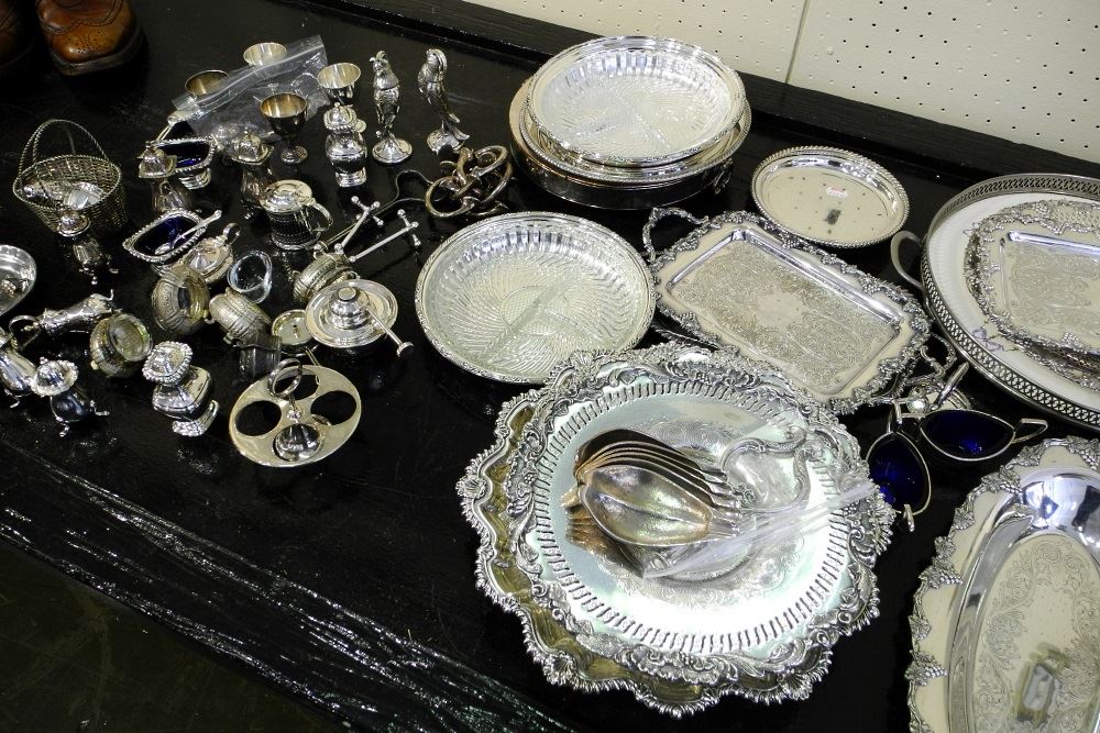 Collection of various silver plated table wares: trays/dishes/salts & peppers/entree dish