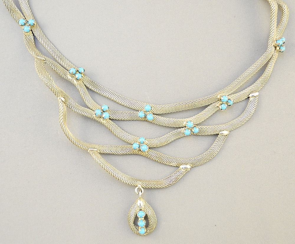 LOT 197 Mesh Chain with Turquoise Cabochons, unmarked, 18" length. Estimate: $75 - $100 Sold For: $70 Auction Date: Tuesday, July 13 2021 at 6:00 PM