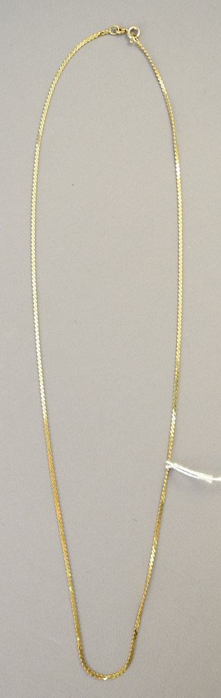 LOT 289 14K Gold Flat Link Chain (marked 585) 24" Long, 5 grams Estimate: $200 - $300 Sold For: $280 Auction Date: Tuesday, July 13 2021 at 6:00 PM