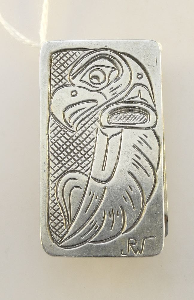 LOT 244 Kwagiulth Silver Money Clip, 1 3/4" high. Estimate: $60 - $100 Sold For: $50 Auction Date: Tuesday, July 13 2021 at 6:00 PM