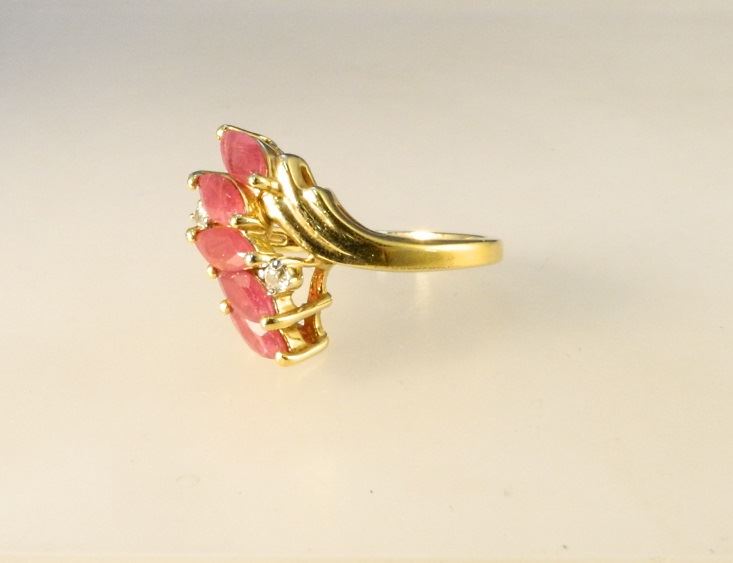 Unmarked Gold (likely 14K) Ring Set with 4 Marquise Cut Rubies, 0.12ozt.