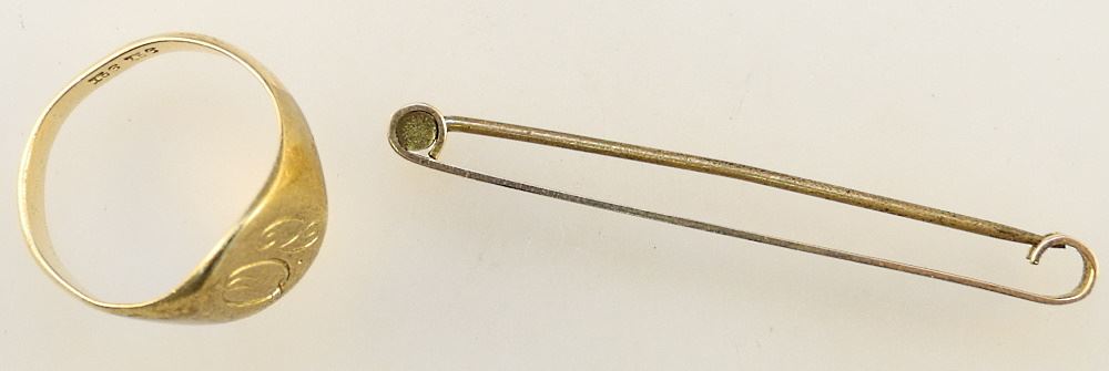 LOT 236 Two 9Kt Gold Items: Signet Ring & Bar Brooch, 5 grams total Estimate: $60 - $100 Sold For: $110 Auction Date: Tuesday, July 13 2021 at 6:00 PM