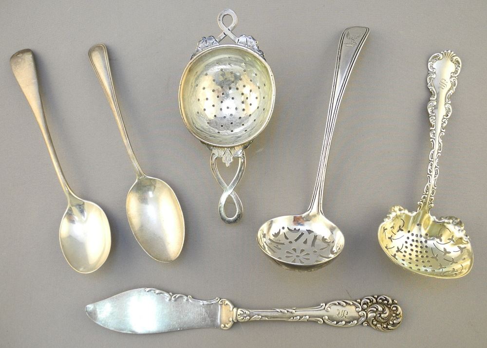 6 Sterling Silver Cutlery Items: Spoons/ Strainers/ Spreader, 169 Grams.